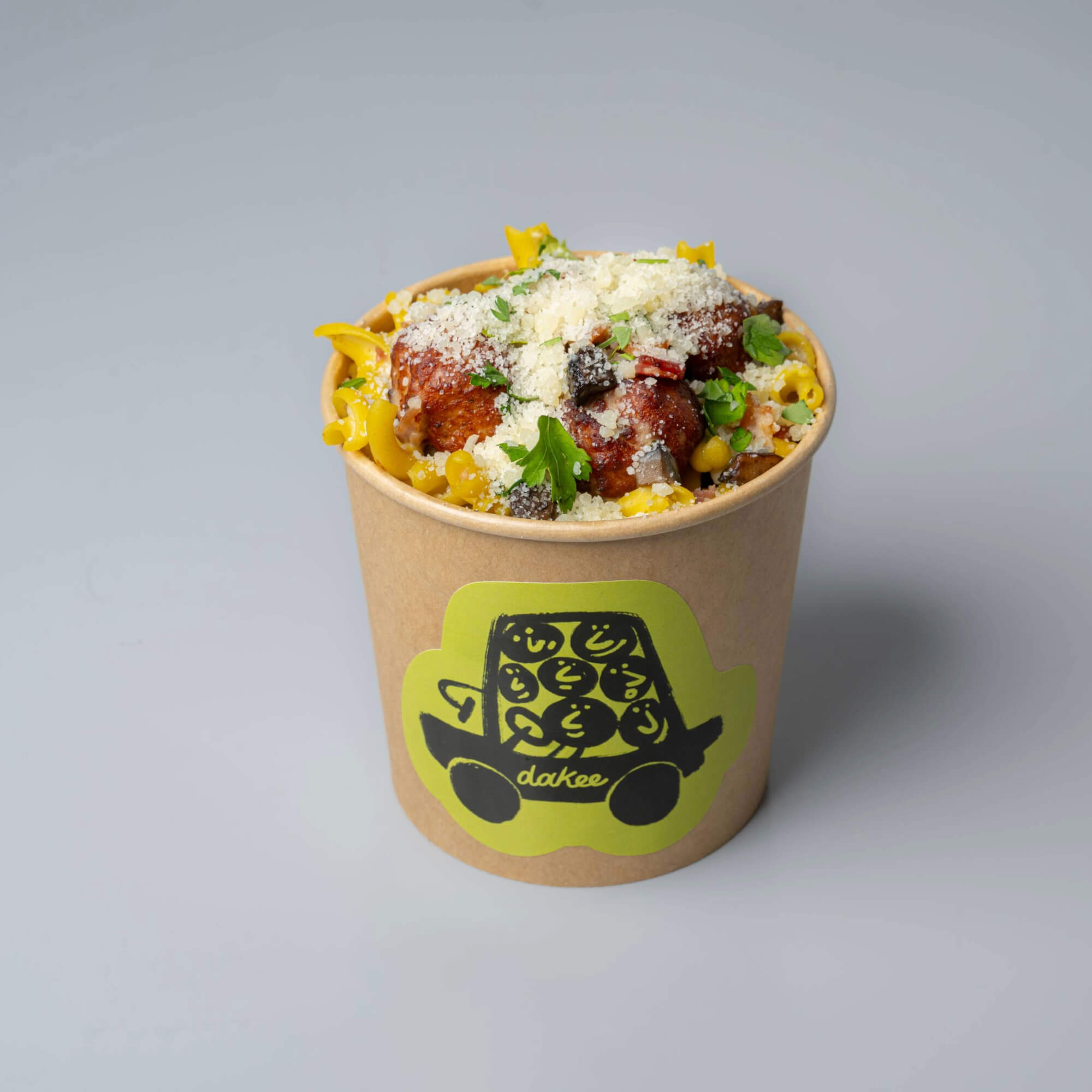 Ζουμερά ανάμικτα κεφτεδάκια, ενισχυμένη, κρεμώδης σάλτσα καρμπονάρα, extra παρμεζάνα-μπέικον-μανιτάρια, συνοδευτικό της επιλογής σας.