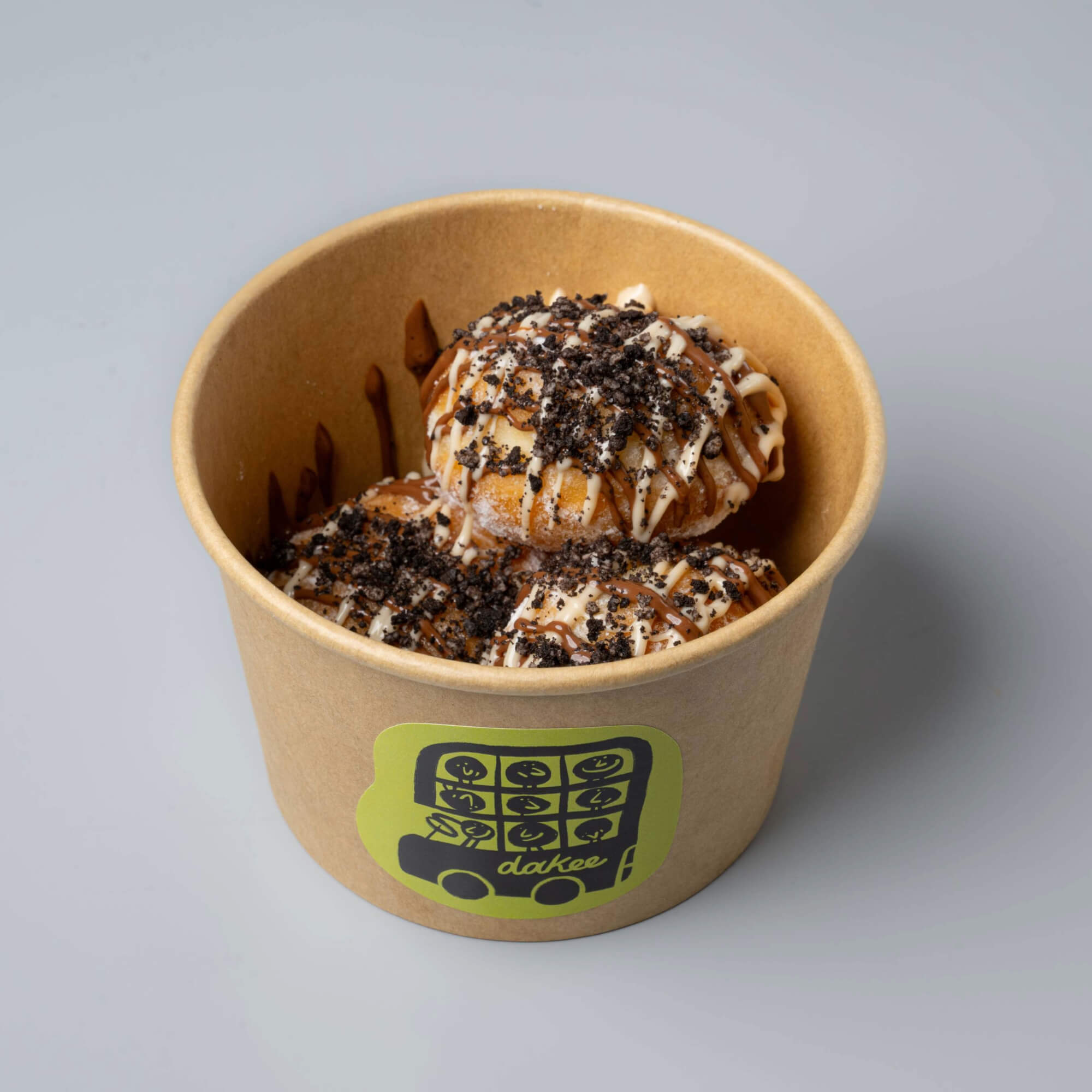 Αφράτα donuts με λιωμένη σοκολάτα, bueno & τριμμένο μπισκότο.